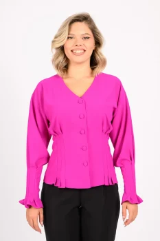Bluza dama roz cambrata pe talie cu maneca strans la baza si design deosebit pe talie. Prezinta inchidere cu nastur si decolteu in V.Produs romanescIntretinereRespectati instructiunile de pe eticheta produsului.Info model:modelul poarta marimea S inaltime 170 cm.Compozitie:100%poliester