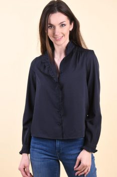 Camasa office/casual din material vaporos de culoare bleumarin cu maneca lunga si manseta cu volanas. Imprimeu buline in tesatura guler usor ridicat croiala lejera ideala pentru a te simti confortabil oriunde o vei purta.IntretinereRespectati instructiunile de curatare de pe eticheta produsuluiInfo model: inaltime 170cm poarta marime S