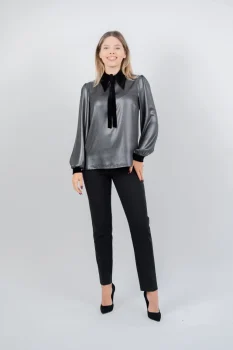Camasa gri un croi clasicdin material peliculizat asimetrica la tiv cu slituri pe laterale. Gulerul si mansetele sunt din catifeaiar la fata se inchide cu doua benzi inguste de catifea.Produs romanescIntretinereRespectati instructiunile de pe eticheta produsului.Info model:modelul poarta marimea S inaltime 170 cm.