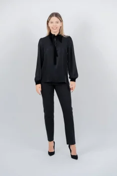 Camasa neagra un croi clasicdin material peliculizat asimetrica la tiv cu slituri pe laterale. Gulerul si mansetele sunt din catifeaiar la fata se inchide cu doua benzi inguste de catifea.Produs romanescIntretinereRespectati instructiunile de pe eticheta produsului.Info model:modelul poarta marimea S inaltime 170 cm.