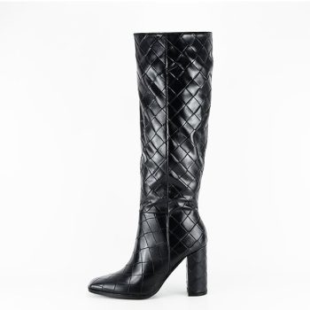 Cizme negre intalte, cu imprimeu geometric din piele ecologica, calitate superioare, toc gros de 9 cm, inchidere cu fermoar, model potrivit la fuste si rochii scurte sau la colanti din piele
