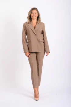 Compleu bej elegant format din sacou cu design deosebit si inchidere la doi nasturi cu detaliu la spate si pantaloni drepti cu inchidere in fata ideal pentru un look versatil in tendinte. IntretinereRespectati instructiunile de curatare de pe eticheta produsuluiInfo model: inaltime 170cm poarta marime SProdus romanesc.Croi: cambrat Culoare: bejMaterial/Textura: 88% poliester 12% spandexStil/Ocazie: de zi/de eveniment