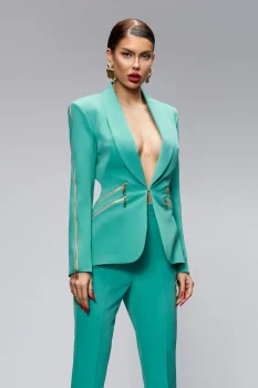 Compleu aqua casual/elegant format din sacou si pantalon lung cu talie inalta conic ideal pentru un look versatil in tendinte. Este format din doua piese pantalon lung cu talie inalta si buzunare laterale acccesorizati cu fermoare si sacou cambrat accesorizat cu fermoare.IntretinereRespectati instructiunile de curatare de pe eticheta produsuluiInfo model: inaltime 170cm poarta marime SProdus romanesc.Caracteristici: Accesorii/Aplicatii: fermoareCroi: cambrat Culoare: aquaMaterial/Textura: 2% Elastan 98% Poliester Stil/Ocazie: elegant