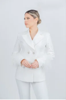 Compleu elegant de culoare alba format din sacou cu guler rever si doua randuri de nasturi pretiosi si pantaloni conici cu talie inalta si buzunare laterale ideal pentru un look versatil in tendinte. Maneca este accesorizata cu pene si strasuri argintiiIntretinereRespectati instructiunile de curatare de pe eticheta produsuluiInfo model: inaltime 170cm poarta marime SProdus romanesc.Compozitie: 88% poliester 12% spandex.