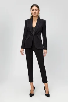 Compleu elegant negru format din sacou cambrat care contureazaa delicat silueta punand in valoar eliniile corpului si pantalon conic cu talie inalta ideal pentru un look versatil in tendinte. Tesatura este una de inalta calitate prevazuta cu detalii intr-o nuanta discreta de argintiu.IntretinereRespectati instructiunile de curatare de pe eticheta produsuluiInfo model: inaltime 170cm poarta marime SProdus romanesc.Compozitie: 88% poliester12% elastan