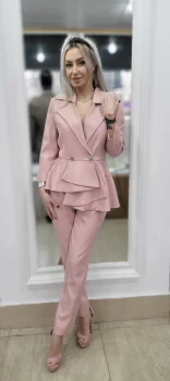 Compleu elegant roz prafuit format din doua piese sacou prevazut cu volane si pene si pantaloni conici