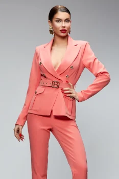 Compleu somon elegant format din sacou accesorizat cu nasturi pretiosi cordon la talie detasabil cu accesoriu si pantaloni lungi cu talie inalta ideal pentru un look versatil in tendinte. IntretinereRespectati instructiunile de curatare de pe eticheta produsuluiInfo model: inaltime 170cm poarta marime SProdus romanesc.Accesorii/Aplicatii: nasturi cordon accesorizat cu o catarama cu cristale Croi: cambrat Culoare: somonMaterial/Textura: 98% poliester 2% elastan Stil/Ocazie: de eveniment sau de zi