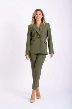 Compleu kaki elegant format din doua piese sacou cu design deosebit si detaliu la spate si pantaloni drepti cu inchidere in fata ideal pentru un look versatil in tendinte. IntretinereRespectati instructiunile de curatare de pe eticheta produsuluiInfo model: inaltime 170cm poarta marime SProdus romanesc.Croi: cambrat Culoare: kakiMaterial/Textura: 88% poliester 12% spandexStil/Ocazie: de zi/de eveniment