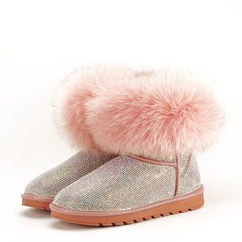 ghete roz imblanite din piele naturala, talpa zimtata captusita cu blanita calduroasa, tapla groasa din cauciuc flexibil, varf rotund, in interior sunt captusite cu blanita eco calduroasa, exeriorul este decorat cu blanita naturala roz si pietricele…