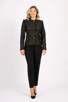 Jacheta neagra tip chanel din stofa tesuta si cambraje care urmeaza linia corpului. In partea din fata este prevazut cu slituri butoniere si nasturi ca sistem de inchidere. Produs romanescIntretinere:Respectati instructiunile de curatare de pe eticheta prodususlui.Info model:Poarta marimea S inaltime 175 cm.Compozitie:63% polyester34% rayon3% spandex.