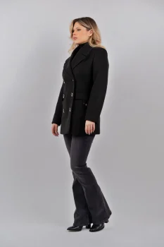 Palton scurt negru confectionat din material de inalta calitate ideal pentru sezonul rece. Se inchide in partea din fata cu nasturi pretiosi prezinta buzunare laterale cu clapeta si inchidere. Croiul jachetei este cambrat.Intretinere:Respectati instructiunile de curatare de pe eticheta produsului.Info model:Inaltime 170 cm poarta marimea S.Produs fabricat in Romania.Compozitie; 80% Poliester 10% Acril 10% Lâna