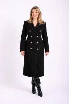 Palton negru cambrat cu șliț la spate și două rânduri de nasturi