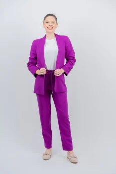 Pantaloni dama casual de culoare mov conic stil casual cu buzunare laterale. La fata are un brau fix prevazut cu un snur decorativ iar la spate are elasticizare pentru comoditate. La fata are fermoar ca sistem de inchidere.Intretinere:Respectati instructiunile de curatare de pe eticheta produsului.Produs romanesc.Info model:inaltime 170 cm poarta marimea SCompozitie: 88% poliester 12% spandex.