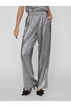 Pantaloni eleganti plisati argintii cu croiala lejera si elastic la talie. Prezinta buzunare laterale si sunt elastici.IntretinereRespectati instructiunile de curatare de pe eticheta produsului.Info model: poarta marimea S inaltime 170 cmCompozitie: 100%