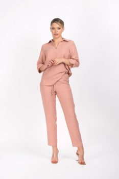 Pantaloni LaDonna de culoare roz prafuit cu croi conic conceputi dintr-un material de vâscoza fin la atingere si fluid pretabil sezonului de vara. Talie medie prevazuti cu design deosebit buzunare laterale talie elatica si snur reglabil. Un basic indispensabil in garderoba unei femei pe un material de buna calitate.Intretinere:Respectati instructiunile de curatare de pe eticheta produsului.Produs romanesc.Info model:inaltime 170 cm poarta marimea S
