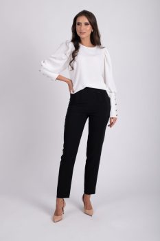 Pantaloni pana negri cu croi conic confectionati din stofa de calitate usor elastica cu inchidere in lateral cu fermoar. Talie inalta prevazuti cu design deosebit. Un basic indispensabil in garderoba unei femei pe un material de buna calitate.Intretinere:Respectati instructiunile de curatare de pe eticheta produsului.Produs romanesc.Info model:inaltime 170 cm poarta marimea S