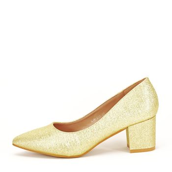 pantofi aurii cu toc gros, partea exterioara este din material textil sclipicios, talpa este din piele ecologica, toc gros, comod, pe talpa are o perinita care ofera comoditate, interiorul este din piele ecologica, varf ascutit, INALTIME TOC – 6 cm NUANTA…