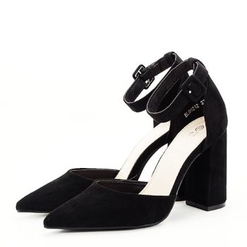 pantofi din piele ecologica intoarsa, decupati lateral, are o bretea in jurul gleznei, talpa este din piele ecologica, se inchide cu catarama, toc gros, in interior, are incorporat in talpa o perinita care ofera comoditate , varf ascutit, INALTIME…
