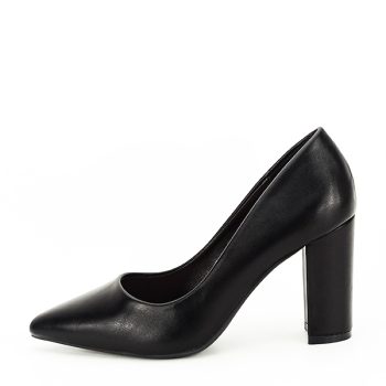 pantofi din piele ecologica negri, talpa este din piele ecologica, in interior, are incorporat in talpa o perinita care ofera comoditate, interiorul este din piele ecologica, toc gros, varf ascutit, feminin, model foarte versatil, potrivit de zi la birou…