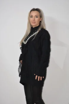 Pulover dama lung cu croiala larga confectionat din 50% BUMBAC si 50% VASCOZA de culoarea negru cu aspect moale si pufos. Este accesorizat cu detalii pretioaase perle si pietre si volane din dantela. Poate fi purtat cu colant.IntretinereRespectati instructiunile de curatare de pe eticheta produsului.Info model: inaltime 170 cm poarta marimea S.