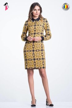 Rochie Xara eleganta croita pe corp prevazuta cu fermoar la spate confectionata din stofa fina. mustar cu imprimeu usor elastica dublata cu captuseala elastica pe interior accesorizata cu un guleras decorat cu perle care se poate detasa. Caracteristicirochie eleganta cu imprimeu fractalstofa usor elasticaprevazuta cu fermoar la spateIntretinererespectati instructiunile de curatare de pe eticheta produsuluiInfo model: inaltime 170 cm poarta marimea SProdus romanesc