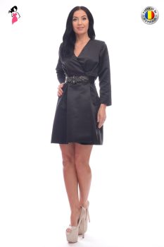 Rochie eleganta tip sacou moderna scurta confectionata din tafta cu epoleti pretiosi cu pietricele si curea detasabila cu accesoriu pe mijloc maneci elegante trei sferturi inchidere cu doua randuri de capse ascunse.Caracteristicirochie tip sacouparte peste parte cu sistem de inchidere ascunsdecolteu in VProdus romanescIntretinere:Respectati instructiunile de curatare de pe eticheta prodususlui.Info model:Poarta marimea S inaltime 170 cm.