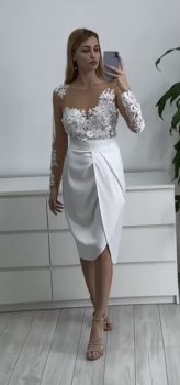 Rochie de ocazie din tafta alba cu aspect petrecut conica de lungime medie.Partea superioara lucrata din broderie pretioasa cu flori 3D perle si pietre bust buretat si fermoar la spate. Maneca lunga din tull cu aplicatie din broderieIntaritura la talie Caracteristicirochie eleganta de ocazie din taftapartea superioara din broderie si cupe cu push-upinchidere cu fermoar la spateIntretinereRespectati instructiunile de curatare de pe eticheta produsului.Produs fabricat in RomaniaInfo model:Inaltime 170cm poarta marimea S.