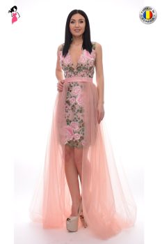 Rochie de ocazie din broderie mulata pe corp cu trena detasabil confectionata din tulle fin de culoare roz pudra . Este confectionata din broderie dublata cu captusala elastica pe interior decolteu in V si inchidere cu fermoar la spate. Se poate purta cu sau fara trena. Este o rochie de ocazie fermoacatoare gratioasa care se potriveste atat doamnelor inalte cat si celor mai scunde daca este accesorizata cu incaltamintea potrivita. Alege rochia cu trena detasabila daca vrei sa fii o aparitie deosebit de feminina si eleganta la evenimentele din viata ta.Caracteristiciculori vii potrivita pentru evenimentele de sezontrena detasabilacroiala dreaptadecolteu in Vinchidere fermoar la spatebroderie pretioasafara manecicaptusala elasticaFabricat in RomaniaIntretinereRespectati instruciunile de intretinere de pe eticheta produsului.Info fotomodel: poarta marimea S are inaltimea de 170 cm.Compozitie: 100% Poliester