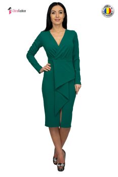 Rochie de ocazie midi cu o croiala mulata dintr-un material elastic si crapatura usor acoperita de un volan potrivita pentru orice tip de ocazie. Decolteu petrecut si lungime medie pana la genunchi. Confera un look sexy elegant si este ideala pentru petreceri .Caracteristicirochie miditesatura jerseu plin elasticbust petrecutfermoar ascunsprodus romanescIntretinereRespectati instructiunile de curatare de pe eticheta produsului.Info model: inaltime 170 cm poarta marimea S.Compozitie: 90%Poliester 10% Elastan