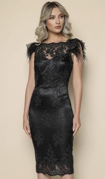 Rochie de ocazie neagra din dantela accesorizata cu pene la umar