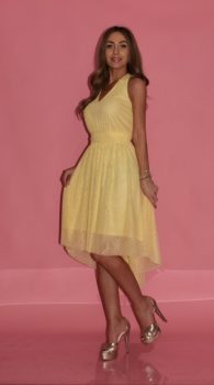Rochie eleganta in clos asimetrica de culoare galbena confectionata din tull cu buline. Prezinta captuseala fina vaporoasa . Decolteu in V inchidere cu fermoar in lateral si bretele care se leaga in spatele gatului. Oriunde o vei purta vei atrage priviri pline de admiratie.IntretinereRespectati instructiunile de curatare de pe eticheta produsului.Info model inaltime 175 cm poarta marimea S
