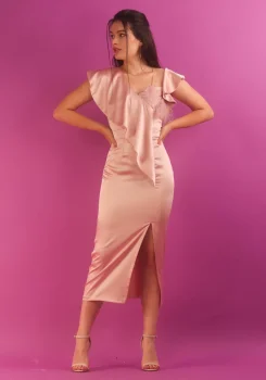 Rochie de ocazie confectionata din tafta vaporoasa usor elastica conica cu lungimea midi slit adanc pe picior. Prezinta maneca scurta tip vaolan volan amplu in lateral si pene in zona bustului. Se inchide cu fermoar la spate croiala rochiei fiind ideala pentru a evidentia minunat silueta perfecta .Intretinere:Respectati instructiunile de curatare de pe eticheta produsului.Produs romanesc.Info model:inaltime 170 cm poarta marimea S.