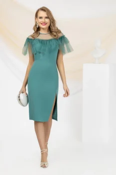 Rochie eleganta conica vernil cu perle si volane din tull in partea superioara