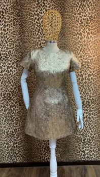 Rochie eleganta confectionata din brocard aurie cu croiala A spre baza si cambrata in zona superioara si a taliei maneca scurta cu design deosebit. Se inchide cu fermoar la spate.IntretinereRespectati instructiunile de curatare de pe eticheta produsuluiInfo model: inaltime 170cm poarta marime SProdus romanesc.Compoztiei: 100% poliester