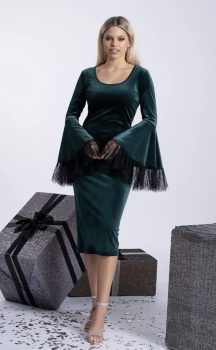 Rochie din catifea eleganta de culoare verde cu lungimea midi si maneca lunga cu terminatia clopot prevazuta cu dantela Chantilly. Se inchide cu fermoar ascuns la spate. Rochia este mulata pe corp si este conceputa dintr-o catifea care are elasticitate.Intretinere:Respectati instructiunile de curatare de pe eticheta produsului.Info model:inaltime 170 cm poarta marimea S.Produs fabricat in Romania.