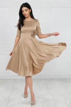 Rochie eleganta din tafta bej accesorizata cu trandafir la talie