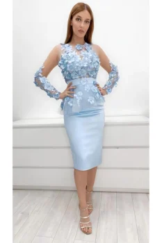 Rochie eleganta mulata pe corp conica cu lungime midi de culoare bleu confectionata din tafta elastica cu partea superioara din broderie din flori 3D. Este prevazuta cu un volan asimetric la talie. Se inchide cu fermoar la spate.Caracteristici:tafta elasticamaneca lunga din broderieinchidere la spate cu fermoarlungime midiIntretinere:Respectati instructiunile de curatare de pe eticheta produsului.Info model:Inaltime 170 cm poarta marimea S.Produs fabricat in Romania.