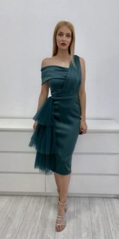 Rochie eleganta din tafta verde cu volane din tull suprapuse in lateral