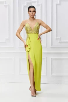 Rochie eleganta galbena cu croi mulat si slit pe picior