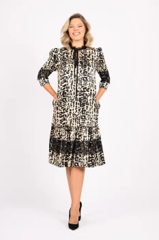 Rochie eleganta midi dreapta confectionata din material satinat cu imprimeu leopard accesorizata cu volan la baza si dantela. Prezinta maneca 3/4 si buzunare laterale functionale.Intretinere:Respectati instructiunile de curatare de pe eticheta produsului.Produs romanesc.Info model:inaltime 170 cm poarta marimea SCompozitie: 100% polyester.Tabel masuratori: