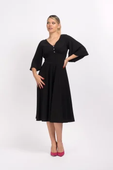 Rochie eleganta neagra fluida confectionata din dublu-voal cu lungimea midi si croiala in clos care avantajeaza orice tip de silueta prezinta maneca scurta lejera bust din voal dublat. Accesorizata in zona taliei cu trei nasturi tip bijuterie decolteu in V. Se inchide la spate cu fermoar si prezinta talie elastica.Intretinere:Respectati instructiunile de curatare de pe eticheta produsului.Info model:Inaltime 170 cm poarta marimea S.Produs fabricat in Romania.
