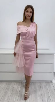 Rochie eleganta din tafta roz prafuit. Este confectionata din tafta elastica cu volane laterale din tull. Prezinta decolteu cu croi deosebit umar cazut inchidere la spate cu fermoar si slit pe picior la spate.Produs romanescIntretinereRespectati instructiunile de curatare de pe eticheta produsului.Info model: inaltime 170 cm poarta marimea S.