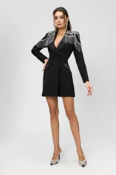 Rochie sacou eleganta de culoare neagra accesorizata cu broderie si franjuri. Prezinta decolteu in V mulata iti va pune in evidenta silueta. Maneci lungi talia marcata inchidere cu doua randuri de nasturi in partea din fata . Este ideala pentru orice ocazie. Completeaza acest look cu un clutch si sandale sau cizme peste genunchi.IntretinereRespectati instructiunile de curatare de pe eticheta produsuluiInfo model: inaltime 175cm poarta marime SProdus romanesc.Accesorii/Aplicatii ; catarama aurie fermoare auriiCroi: mulatCuloare: neagraMaterial/Textura: 12% Elastan 88% PoliesterStil/Ocazie: de ocazie de club