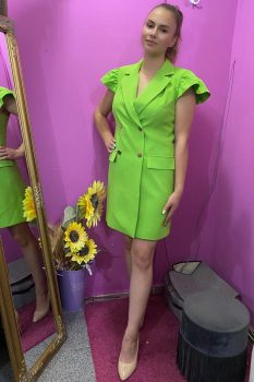 Rochie sacou verde cu revere si maneca scurta tip volanas. Inchidere in partea din fata cu doua randuri de nasturi MAXI. Fii speciala oriunde alegi sa o porti: club nunta petrecere sau de zi.Intretinere:Respectati instructiunile de curatare de pe eticheta produsului.Info model:inaltime 170 cm poarta marimea S.