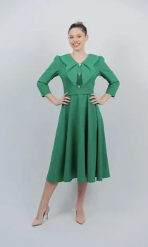 Rochie eleganta verde midi cu croi in clos. Decolteu in V si nasturi decorativi guler maxi si cordon detasabil. Se inchide la spate cu fermoar nu prezinta captuseala. Material stofa.Produs romanescIntretinereRespectati instructiunile de curatare de pe eticheta produsului.Info model inaltime 175 cm poarta marimea SCompozitie: 88% Poliester 12% SpandexVa rugam verificati eticheta produsului inainte de curatare!
