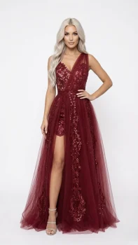 Rochie grena lunga de tull cu broderie pretioasa