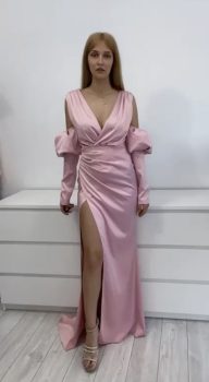 Rochie eleganta lunga confectionata din tafta elastica croita parte peste parte cu despicatura pe mijloc. Partea superioara cu design deosebitsi maneci clopot. Rochia are prindere cu fermoar la spate si atre talia marcata. sofisticata si deosebita rochia roz prafuit din tafta este alegerea perfecta pentru evenimentele tale speciale.IntretinereRespectati instructiunile de curatare de pe eticheta produsuluiInfo model: poarta marimea S inaltime 170cm.