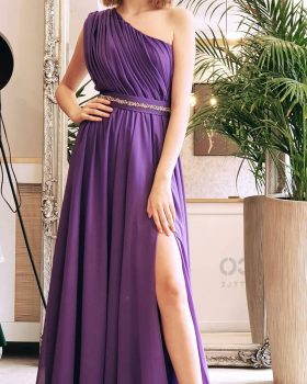 Rochie lunga de ocazie din voal mov accesorizata cu pense in zona superioara si centrura detasabila