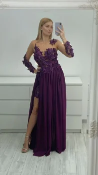 Rochie lunga eleganta vaporoasa confectionata din voal de culoare mov cu partea superioara prevazuta cu broderie pretioasa florala 3D si perle. Bust buretat inchidere la spate cu fermoar. Maneci lungi din tull transparent accesorizate cu broderie florala si perle. Partea superioara continua spre baza cu broderia sub forma de fusta astupata de voal care prezinta slit in lateral. Pretioasa si misterioasa rochia din voal este tinuta perfecta pentru a te face remarcata si adrmirata la evenimentele la care iti vei face aparitia.Caracteristicivoal si broderie 3Dcupe push-upelastica la taliefermoar la spatemaneci lungicrapatura pe piciorProdus romanescIntretinereRespectati instructiunile de curatare de pe eticheta produsuluiInfo model- inaltime 170 cm poarta marimea S.Compozitie: 90% Poliester 10% Elastan