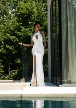 Rochie sirena de culoare alba cu trena confectionata din tafta elastica cu despicatura pe mijlocul fustei si partea superioara mulata accesorizata cu floare si cupe buretate. Decolteu in V spatele gol accesorizat cu lant pretios cu perlute si fusta lunga cu slit pe un picior si trena iti vor completa look-ul avangardist. Sofisticata si deosebit de eleganta este alegerea perfecta pentru evenimentele tale speciale.IntretinereRespectati instructiunile de curatare de pe eticheta produsuluiInfo model: poarta marimea S inaltime 170cm.Produs fabricat in Romania